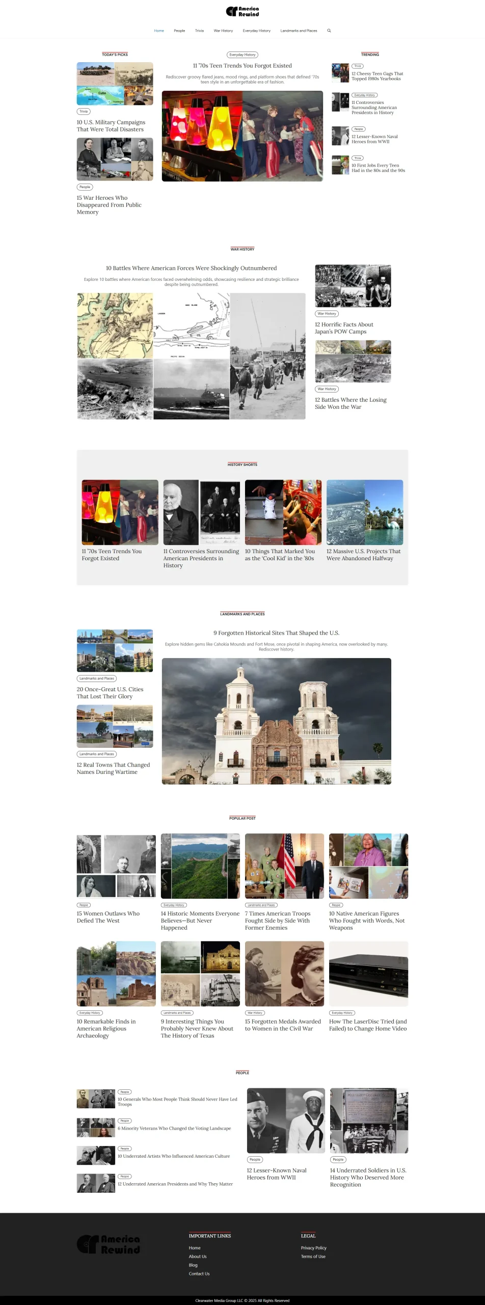 America Rewind is an American history publication owned by Clearwater Media Group LLC, Sheridan, Wyoming, USA — making this the 4th website Amod Khan Design has built for this established US media company. The blog covers five well-defined content categories — People, Trivia, War History, Everyday History and Landmarks & Places — with a consistent publishing schedule and a growing library of engaging historical content.