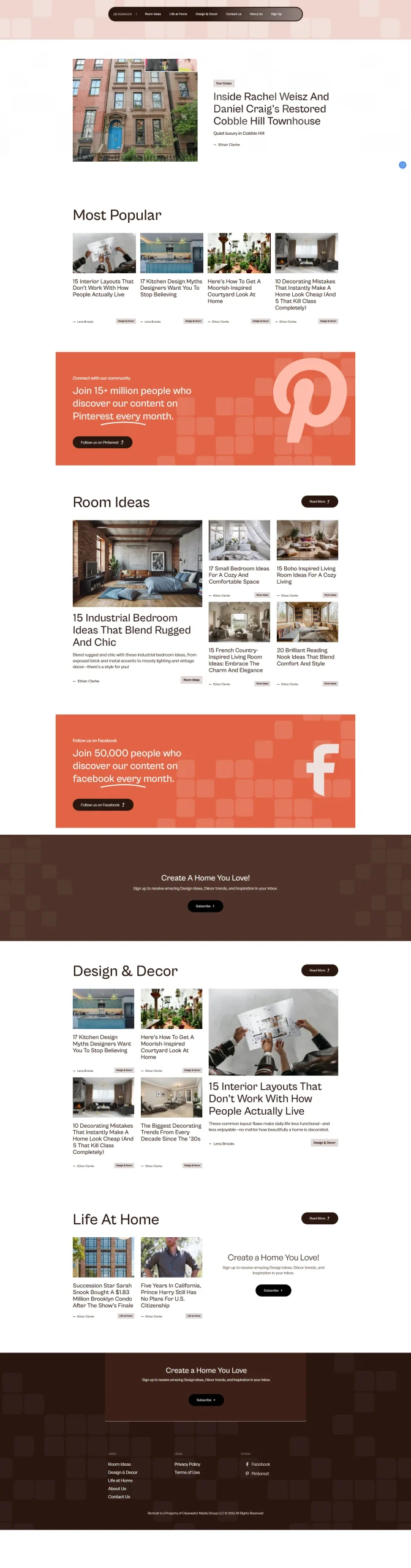 Custom editorial homepage with featured hero post, category strips — Room Ideas, Design & Décor, Architecture, Life at Home